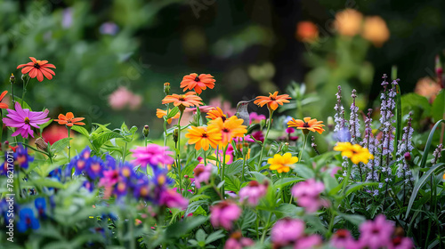 Vibrant garden scene with colorful flowers and hovering hummingbird