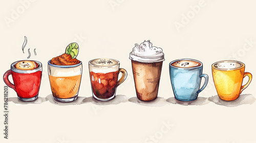Hand-drawn illustration of a variety of coffee drinks in colorful cups