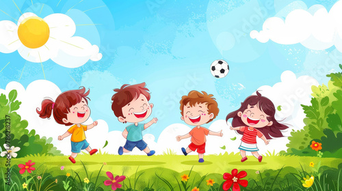 Joyful cartoon kids playing soccer in a sunny field with a vibrant background
