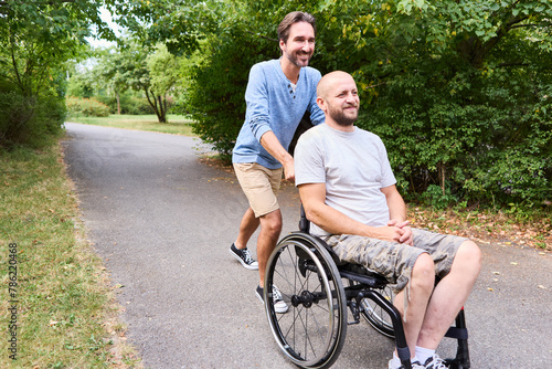 Man in wheelchair enjoying a sunny day at the park with friend