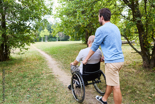 Friendly outing: Person with wheelchair enjoys a park walk with companion