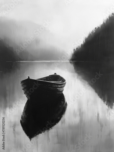 A serene lake at dawn with a lone rowboat gently floating amid misty woodlands