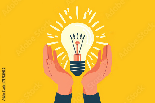 Bright idea concept with two hands holding a glowing light bulb illustration