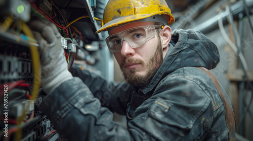Close-up portrait of a rugged logger in the forest wearing safety gear