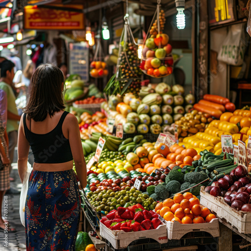 Animated young woman exploring a vibrant fruit market with diverse fresh produce