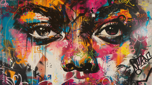 Vibrant graffiti eyes on a cracked urban wall, embodying street art