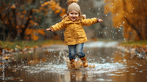 Joyful little girl playing in a puddle wearing rubber boots in autumn