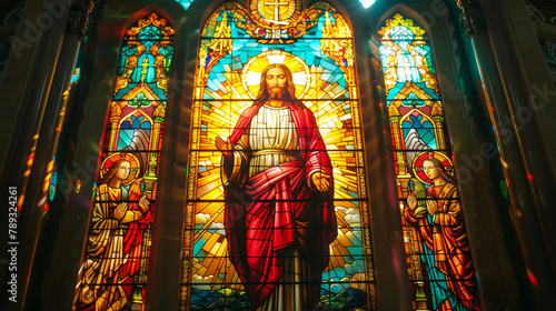 Stained glass window depicting Jesus Christ with radiant colors in a church setting