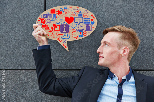 Geschäftsmann hält Sprechblase mit Icons