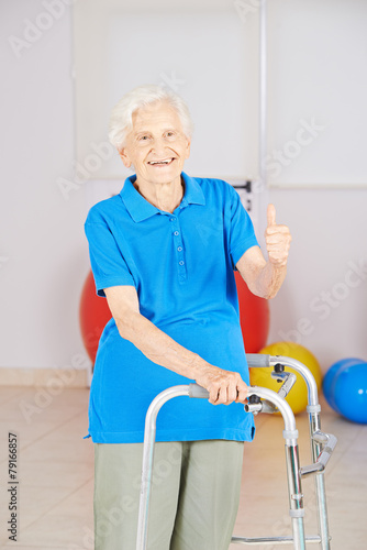 Alte Frau mit Gehhilfe hält Daumen hoch