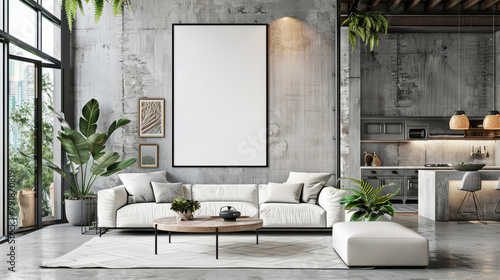 Modern living room with blank frame on concrete wall, white sofa, and large windows showcasing greenery