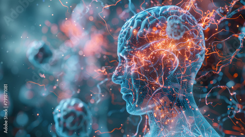 Detailed 3D illustration of human brain and neural network in blue and red tones