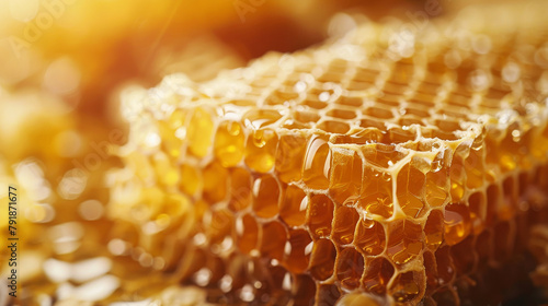 Close-up view of a natural honeycomb structure oozing with golden honey