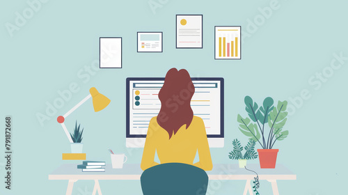 Illustration of a smiling woman wearing glasses sitting in a modern setting