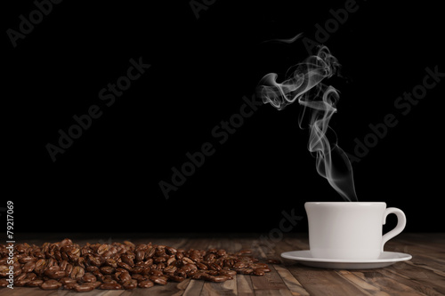 Frische Tasse Kaffee auf Tisch aus Holz mit Kaffeebohnen