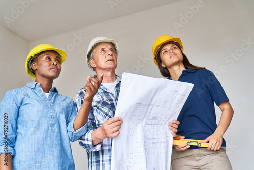 Diverse team group of female construction workers and architect with blueprint