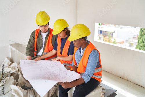 Diverse construction team discussing while examining blueprint of house at incomplete site
