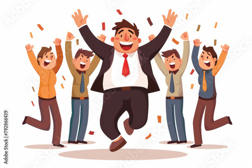 Cartoon businessman celebrating success with cheerful colleagues