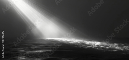 Singular ray of light piercing through darkness, close-up abstract in black and white
