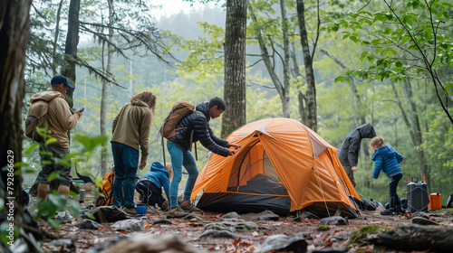 Family and friends setting up a tent in a lush forest campground, embracing the essence of outdoor adventure