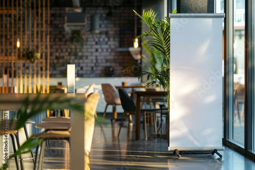 Blank roll-up banner display indoors with modern restaurant background