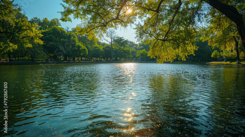 Sunlit river with lush trees in spring - a tranquil nature scene