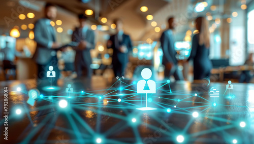Business people collaborating in a high-tech office environment with digital connectivity concept