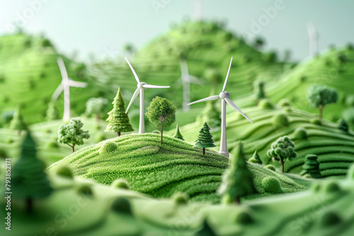 Arty 3D rendering of lush green hills dotted with wind turbines and trees