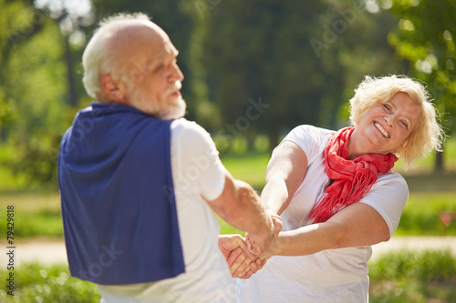Glückliches Paar Senioren beim Tanzen im Garten