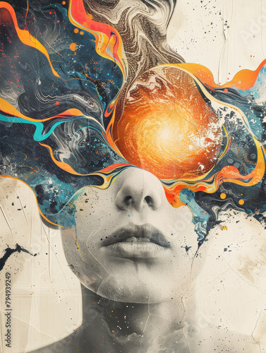 Contemporary art collage featuring a woman's profile with vibrant geometric shapes and textures