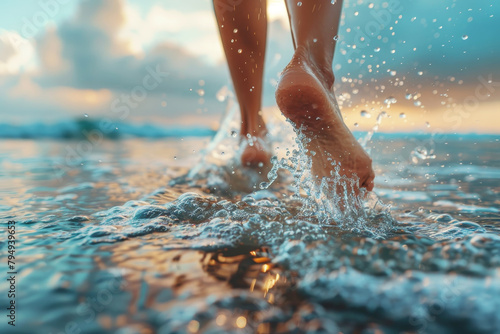 Close-up of feet jumping into water on a sunny day, evoking feelings of joy and freedom