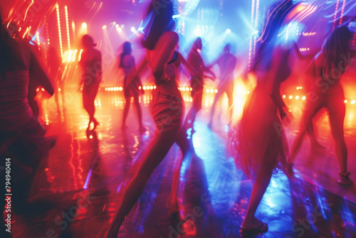 Vibrant nightclub scene with energetic crowd dancing under neon lights