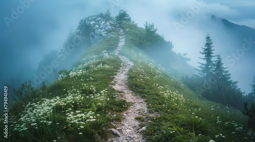 Misty mountain trail with blooming wildflowers and foggy ambiance