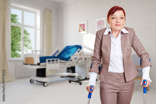Frau mit Krücken als Patientin im Krankenzimmer