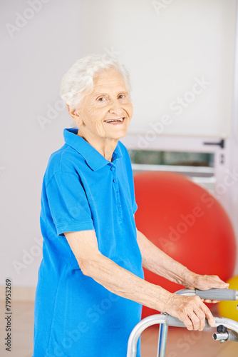 Sehr alte Frau mit Gehgestell bei der Physiotherapie