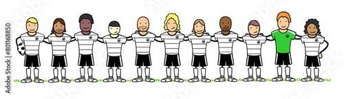 Diverse team of cartoon soccer players lined up in Italian jerseys