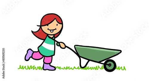 Cartoon girl pushing empty wheelbarrow for gardening