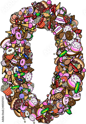 Ziffer 0 zusammengesetzt aus vielen bunten Süßigkeiten