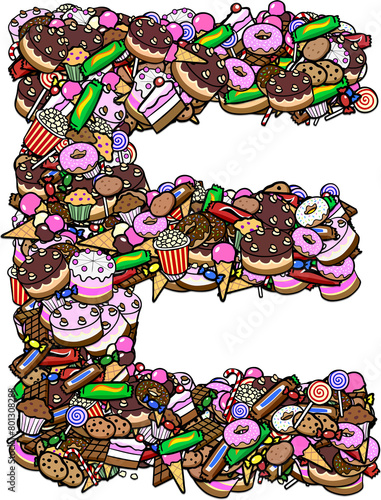 Buchstabe E zusammengesetzt aus vielen bunten Süßigkeiten