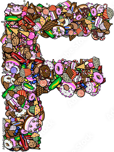 Buchstabe F zusammengesetzt aus vielen bunten Süßigkeiten