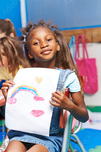 Mädchen zeigt gemaltes Bild im Kindergarten