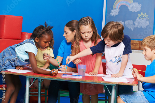 Frau als Kindergärtnerin mit Gruppe Kinder