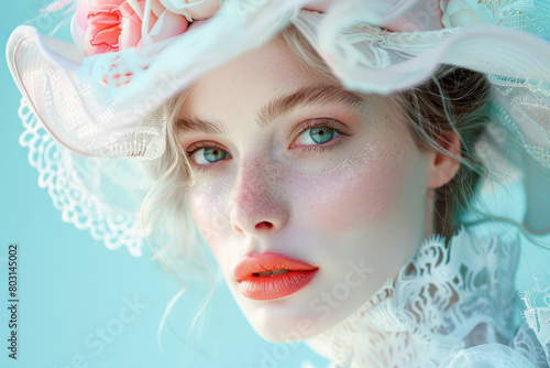 Elegant Close-up Portrait of a Woman with Floral Hat, Subtle Makeup, and Freckles