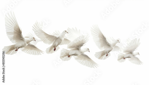 Elegant flight of white doves against a clear sky, symbolizing peace and freedom