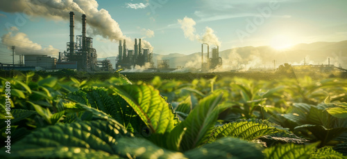 Green plants in focus with industrial plant and smoke stacks in the background