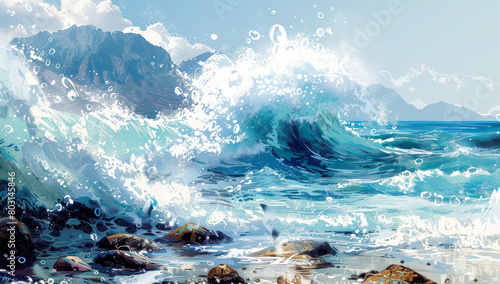 Vivid art of large waves crashing on rocky shores with distant mountains
