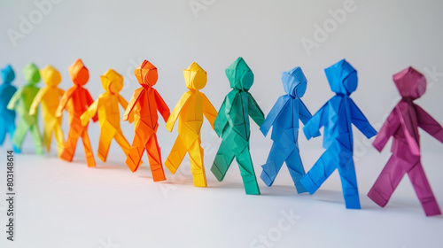 Colorful paper dolls in a row symbolizing unity and diversity on a white background