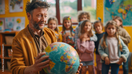 Teacher explaining geography with a globe in a vibrant classroom full of children
