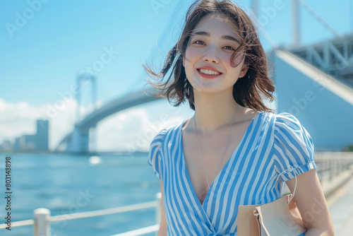 Young Asian woman enjoying a sunny day near iconic suspension bridge