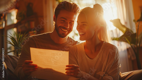 Joyful couple celebrates good news with a letter at home